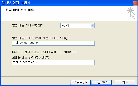 6. 받는 메일 서버종류를 POP3로 지정하신 후 받는 메일 서버(POP3)란에 mail.도메인 을 입력하면 됩니다.